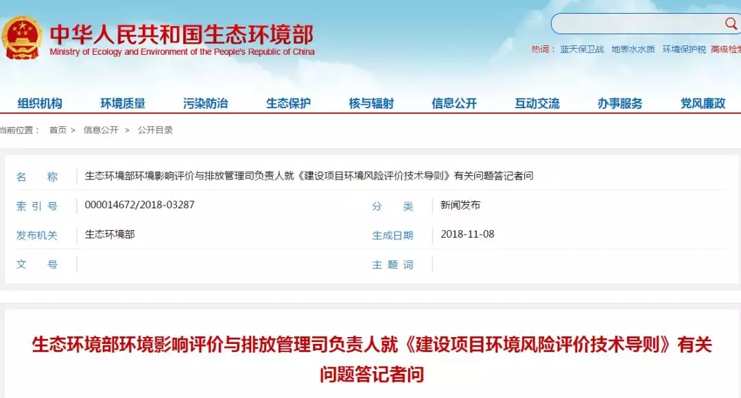 生態(tài)環(huán)境部日前印發(fā)了《建設(shè)項目環(huán)境風險評價技術(shù)導則》(HJ169-2018)(以下簡稱《風險導則》),生態(tài)環(huán)境部環(huán)境影響評價與排放管理司負責人就《風險導則》修訂的背景、思路及內(nèi)容等有關(guān)問題回答了記者的提問。